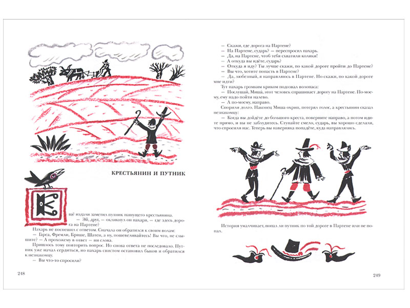 Как любой фольклорный сборник, эту книгу можно читать с любого места и столько, сколько захочется, потому что каждая сказка – бытовая, волшебная, о животных – совершенно самодостаточна. К тому же, кроме сказок в сборнике представлены стихотворные загадки, поговорки, песенки-небылицы, короткие рассказы-шутки, которые тоже нравятся малышам. Такой вариант знакомства с Францией отлично подойдет для пяти-шестилеток, которым вполне хватит общего понятия о стране, где некогда жили легко представимые короли и принцессы, а также более загадочные сеньоры, вилланы и кюре (значения этих, скорее всего новых для детей слов вынесены в сборнике в сноски). Кстати, заодно и объясним, что вилланы – это старинное название крестьян, работавших на земле, сеньоры – хозяева этой земли, а кюре – так издавна называли во Франции священников. Старшие дошкольники, имея опыт слушания русских народных сказок, легко уловят характерные особенности именно французских сказок. К примеру, здесь почти нет традиционных для русского фольклора образов отца и трех сыновей, из которых младший умнее и удачливее остальных, почти нет сказок о подвигах царевичей и битвах со змеями. Зато целый пласт текстов повествует о трудолюбивых, смекалистых и прижимистых французских крестьянах. Они в одиночку ловко одурачивают своих жадных и глупых господ и сами становятся богачами, как, например, в сказке «Епископ и мельник», где простой крестьянин так озадачил своими остроумными ответами важного епископа, что тому пришлось, ни много ни мало, сделать его приходским священником. Каково расстояние от Земли до Солнца? Один взгляд. Какова глубина моря? Один бросок камня. В самом деле, человек, отвечающий так мудро, достоин того, чтобы разбогатеть! В сказке «Волшебный перстень» бедняк-пекарь сумел не только взять в жены спесивую дочь зажиточного мельника, но и получить волшебный перстень и деньги в придачу. А в марсельской сказке «Жан и король» фермер обвел вокруг пальца самого короля.