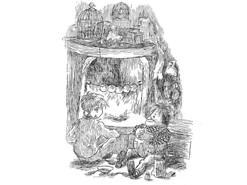 Со всеми этими сластями они полетели на крышу, в домик Карлсона. Все это совершенно буднично, а вот верстак, стоявший у Карлсона, и камин с железной решеткой и таганком – волшебно и непонятно.