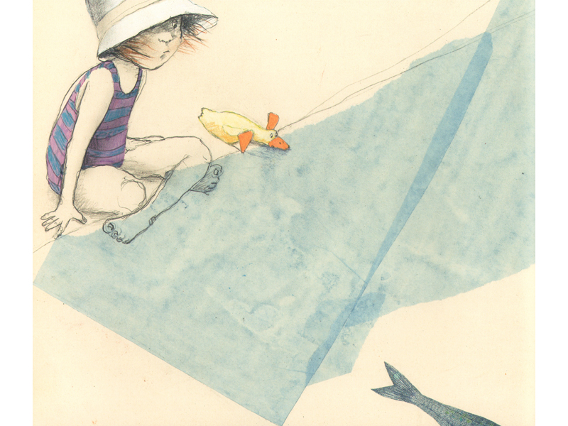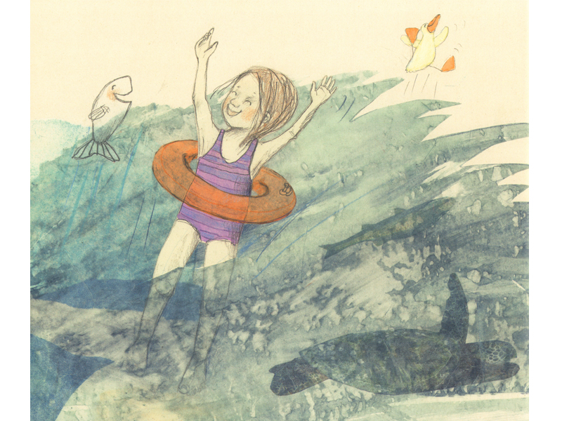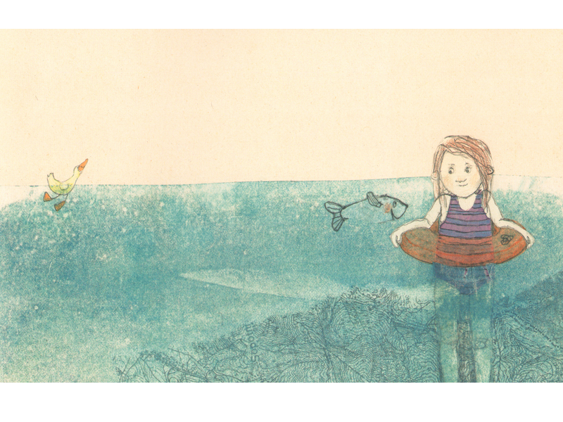 Другой взгляд – художника. В первой и последней картинках он показывает контекст истории: вот папа с мамой в шезлонгах, а Амели одна на берегу; а вот, в конце, папа с мамой уходят, а Амели снова поодаль – прощается с подружкой. Мама лишь слегка поворачивает голову, чтобы посмотреть: идет ли Амели за ними? На иллюстрациях, где девочка играет с рыбкой, они только вдвоем. Когда Амели приходит утром на море, желая пленить рыбку, она тоже как будто одна.
