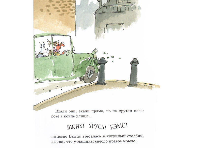 Вторую книгу, «Миссис Бампс за рулем», Квентин Блейк написал спустя шестнадцать лет после первой. И там как раз обыгрывается эта легкость расставания с тем, что в силу разных обстоятельств пришло в негодность. Автомобиль последовательно лишается дисков на колесах, бампера, капота, крыши, дверец и багажника. В результате машина превращается в квадроцикл. Но главное – происходит раскрепощение героини. Теперь это не робкий начинающий водитель, а «настоящая королева дорог».