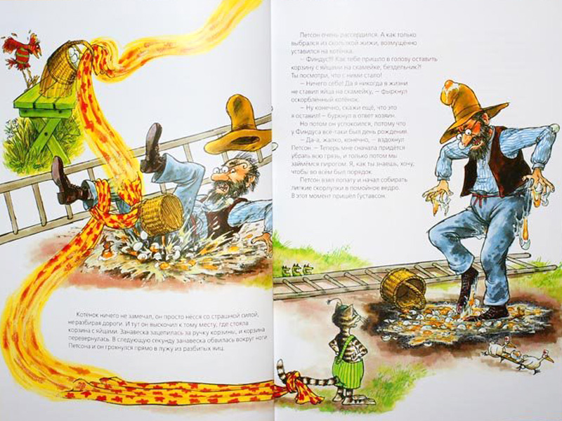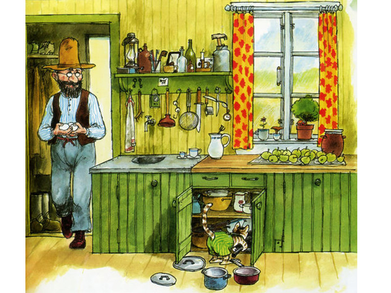 С нетерпением жду возвращения в город – вот где раздолье и множество книжек для маленьких с отличными иллюстрациями! Да и истории про Петсона и Финдуса у нас собраны все, еще с тех пор, как Мите исполнилось два года. Впрочем, он с наслаждением рассматривает их и сейчас. Да я и сама люблю это делать – все время находятся новые и новые мелочи, хотя кажется, что картинки изучены уже вдоль и поперек.