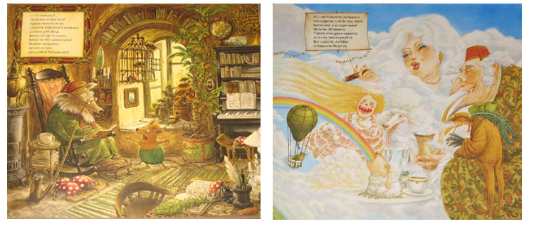 Я влюбилась в Нурдквиста именно за его иллюстрации, смешные и трогательные. Они возвращают напрямую в наше собственное детство: помните, как это – лечь в траву и представить себя маленькой, живущей в травяном лесу? Все листья, жучки и муравьи оказываются соразмерны тебе, и столько всего открывается в этом крохотном мире! Примерно это и происходит, когда смотришь иллюстрации Нурдквиста – каждая страница являет собой такой мирок. Кроме главных действующих героев, которые очень характерны, буквально каждая букашка, каждый цветок живет своей жизнью и тоже имеет характер. Главное – правильно настроить зрение. Это, кстати, несложно: трехлетнего Митю я просила отыскать на картинке, где изображена мастерская Петсона, молоток... а уж спрятавшуюся под столом курицу, портрет любимой коровы в рамке на стене, постель неведомой зверушки в одном из ящиков – все это он находил сам. И очень радовался всем маленьким забавным открытиям.