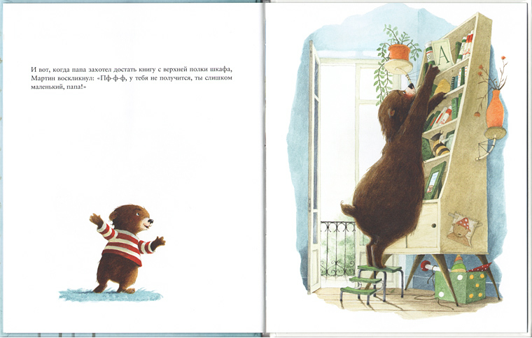 И вдруг, когда папа хочет достать книгу с верхней полки шкафа, медвежонок ехидно замечает: «У тебя не получится, папа. Ты слишком маленький!» А когда мама готовит полдник и облизывает палец, испачканный шоколадной пастой, медвежонок заявляет: «Мама, ты слишком большая, чтобы так делать!» Что это?