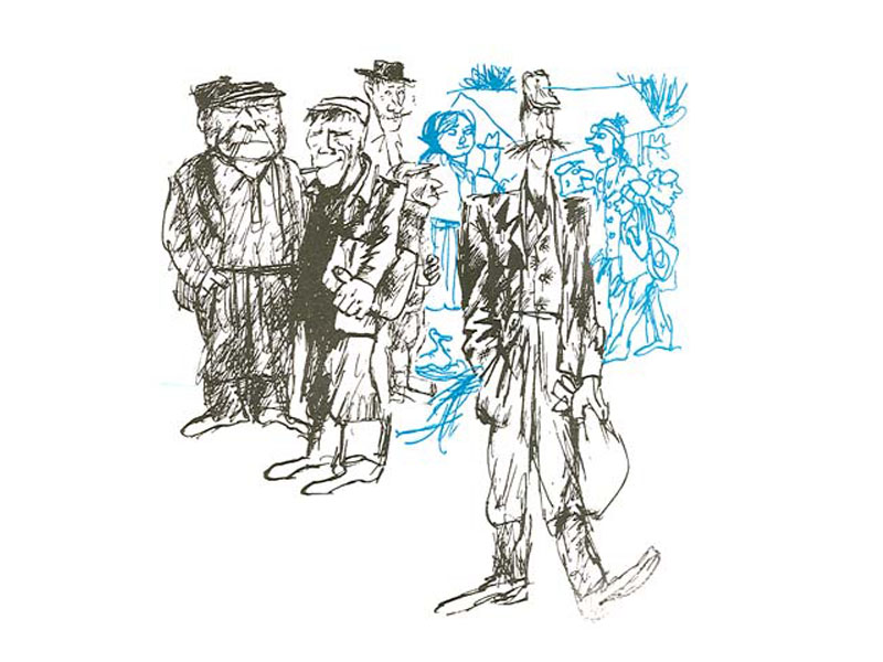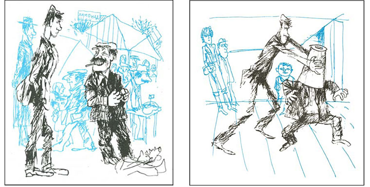 У меня очень старое издание этой книги, 1977 года, его читала в детстве еще моя мама. Здесь очень необычные иллюстрации художника Г.Калиновского. Все картинки выполнены в двух цветах: голубым цветом показаны второстепенные герои и события, «фон», а в черном цвете – главные. Немного напоминают карикатуры, но разглядывать их очень интересно.