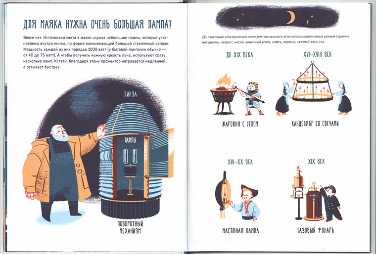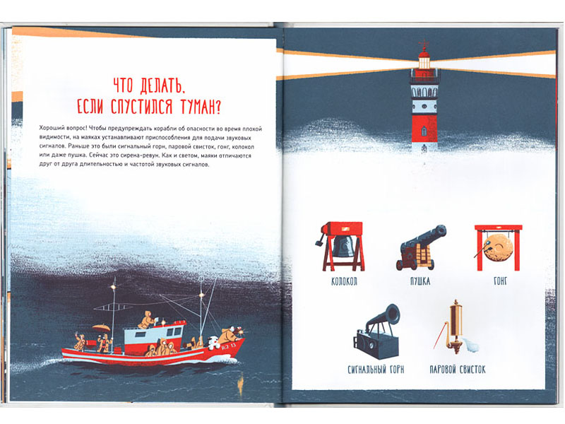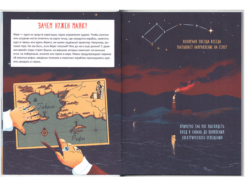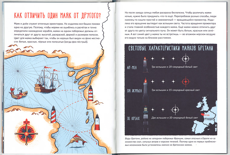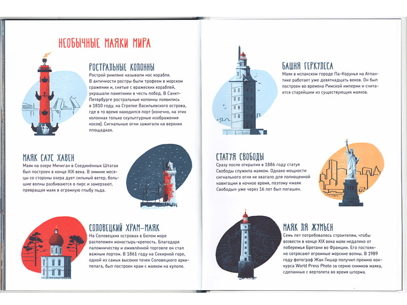 Скажу честно, эта книга – форменный искуситель, в хорошем смысле этого слова. Потому что после разглядывания разворота с уникальными маяками хочется увидеть их вживую. Или хотя бы набрать с ребенком в поисковике интернета «маяк Саус Хавен, Мичиган», похожий на глыбу льда, или «маяк ля Жумьен во время шторма» и вместе поразиться мощи стихии, представив себя мореплавателями времен Жюля Верна и Майн Рида.