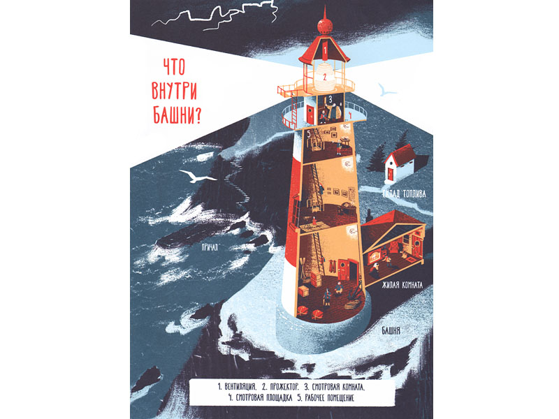 Важная деталь, пока мы не раскрыли книжку: все изображенные на обложке маяки – не плод богатого воображения художника, все они реально существуют. Внутри можно найти их названия и справочную информацию по самым необычным из них.