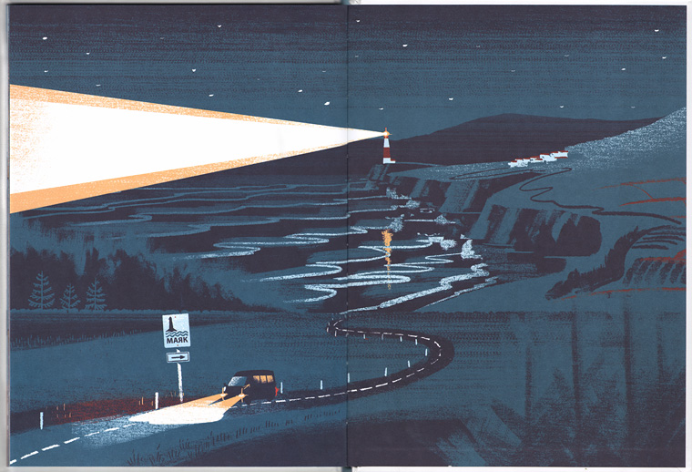 А на последнем форзаце книги берег уже погрузился во тьму, и «тёмный крепдешин ночи окутал жидкое тело океана». Возвращается в город школьный автобус, и видно, как мощный прожектор маяка рассекает пространство, помогая кораблям не сбиться с курса.