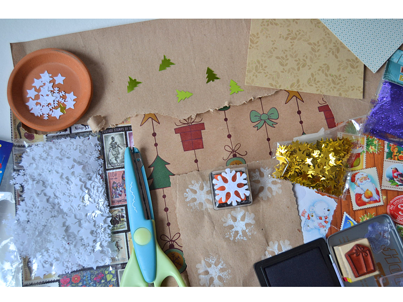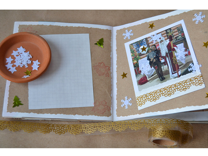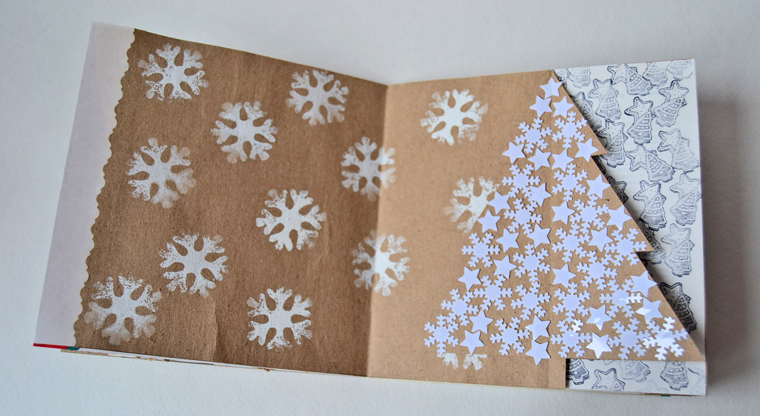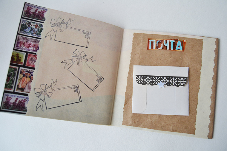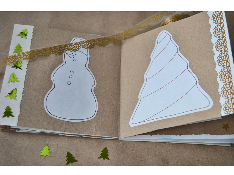 Художница Елена Гирш поможет вам сделать книгу-коллаж на основе праздничного буклета: только нужно обклеить его страницы упаковочной бумагой. (Можно использовать и любую другую бумагу, которая соответствует вашему замыслу.)