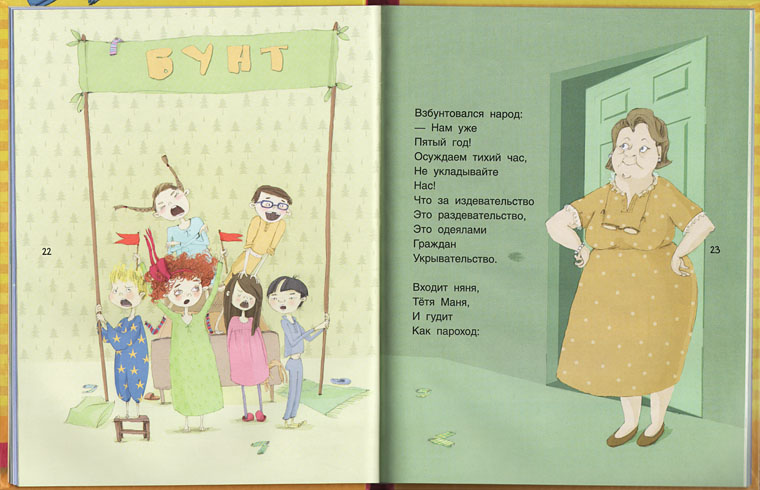 Стихи про младенцев хочется цитировать бесконечно. Но младенцы очень быстро вырастают, и многие из них отправляются в детский сад. «Садиковские» стихи Маши Рупасовой собраны в книге «Не дети, а слоны, или Все в сад!». Тут уже совсем другая жизнь: воспитатели лепят снеговиков, нянечки укладывают группу на тихий час, ноги Насти и Ромы беседуют и качаются на качелях, «гонки» с ужасным грохотом рвутся к победе (для мам девочек поясним, что «гонками» называются гоночные машинки мальчиков). Мамы и папы, конечно, тоже есть в этой книжке, но главную роль в «садиковских стихах» играют сверстники, улица, машины, кошки, носки, шкафы. Тот самый предметный мир, который больше всего интересен детям 3‒7 лет.