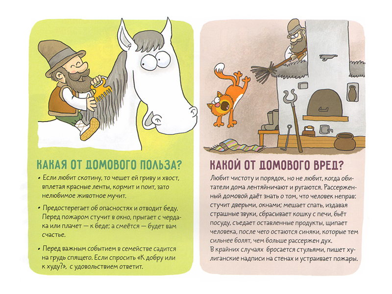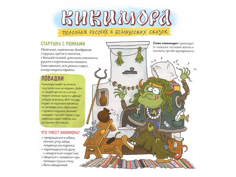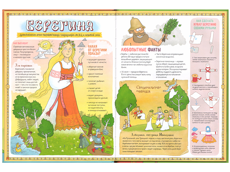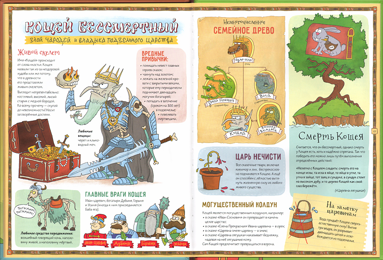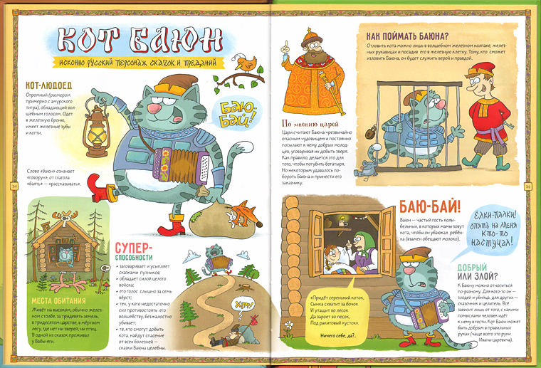 Здесь нет длинных описательных текстов или пересказов сказок. Зато почти на каждом развороте есть постоянные «рубрики»: как выглядит персонаж, какими способностями обладает, где обитает, какие у него повадки. Приведены любопытные факты и список сказок, в которых действует этот герой. Встречаются и несложные задания для читателей: найди два одинаковых пера жар-птицы, семь отличий между картинками и т.д.