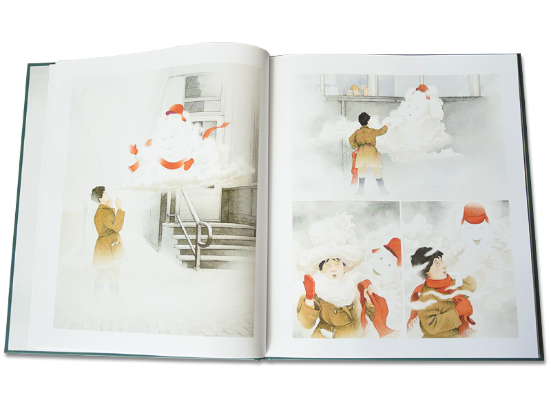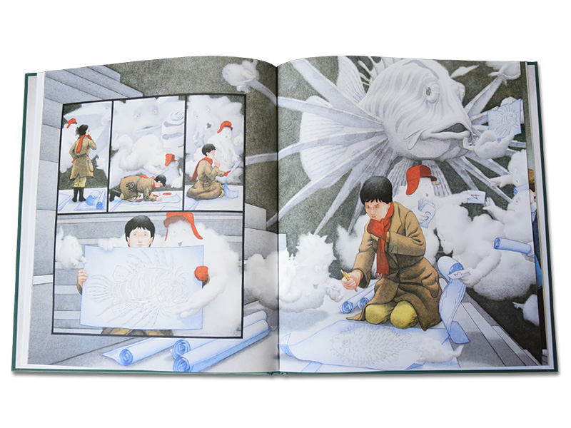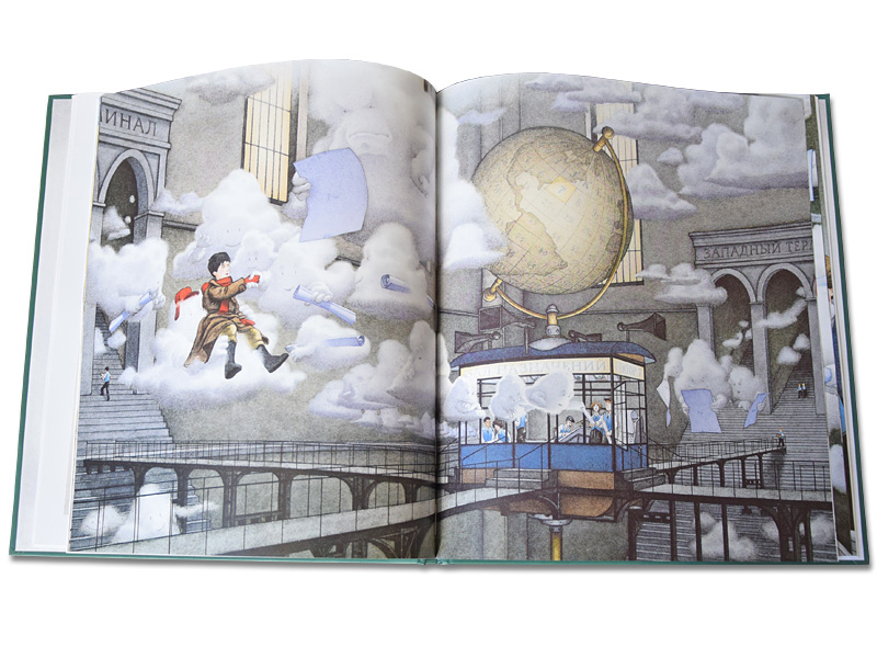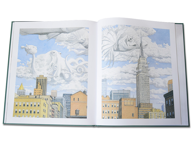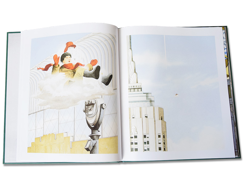 Форзац застилает туман, сквозь который проглядывают шпили какого-то здания и огромные таинственные трубы на крыше. А на первой странице маленький мальчик увлеченно рисует свои фантазии на запотевших окнах, совершенно не обращая внимания на окружающих, будто весь мир сосредоточен только на картинках, которые возникают под его теплыми пальцами. Следующая страница встречает нас видом величественного Эмпайр-стейт-билдинга. Художнику удалось передать всю мощь этого огромного 103-этажного здания. Люди на улице кажутся совсем крошечными, будто их рутинные повседневные дела и проблемы не имеют значения там, наверху. Интерес к книге накрывает тебя с головой, как туманы слой за слоем накрывают Нью-Йорк.