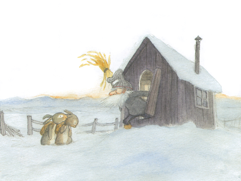 А тем временем вся кроличья семья беспокоится о зайчатах. Куда они могли подеваться? Вдруг их схватила лиса? Дедушка предлагает сесть в кружок и сильно-сильно про них подумать ‒ тогда они почувствуют это и вернутся домой. Сережа не сомневается, что это сработает, ведь он всегда думает, что папа скоро придет с работы. И, конечно, Бука вместе с зайчатами (шмель у него с собой в маленьком коробке) едет на санках, он привез детей, а дети привели гнома. Вот теперь наступает настоящее Рождество.