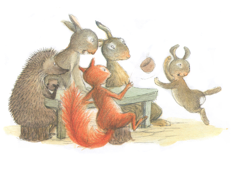 На следующей странице появляются новые герои. В семье лесных кроликов царит согласие. Каждый занят своим делом. На картинке ребенок безошибочно показывает маму-зайчиху ‒ она варит сок, дядю Кину, который делает гимнастику, папу кролика, чистящего цилиндр, и тетю Инку, которая заворачивает яблоки в кленовые листья. Дедушка-кролик раздумывает о том, почему «когда что-то падает, оно падает именно вниз», а еще он объясняет маленьким зайчатам, что такое зима. Сережу тоже это интересует, он ждет только Новый год, но потом, по его мнению, сразу должно наступить лето. Он соглашается с дедушкой: «Зима – это когда мороз кусает за нос, и все становится белым, как цветная капуста» (и Сережу кусает мороз, даже за сапожки). А Рождество бывает, когда приходит гном, ‒ об этом сообщают старые вороны, прочитавшие табличку, которую ветер сорвал с забора. Любопытные зайчата принесли табличку в норку, но дедушка не смог ее прочитать, мудрая сова перепутала буквы, а вороны прочитали: «П, Р, Д… ОМ». И это тоже понятно Сереже, ведь он знает, какие эти буквы коварные: не дорисуешь кружочек, и буква-колечко превращается в букву-С (Сережа) – никак не уследишь!