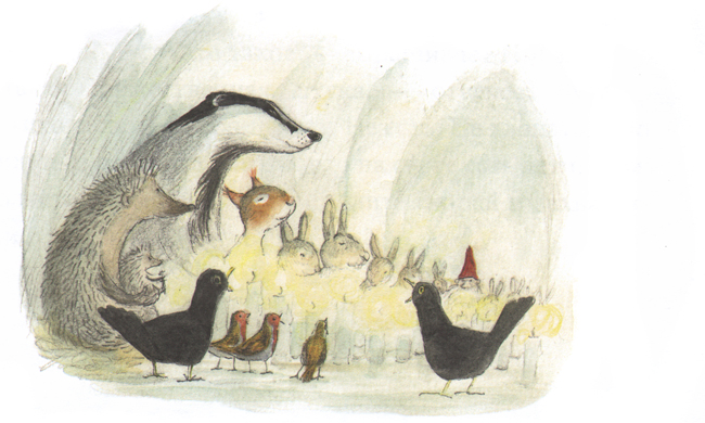 И вот мы садимся поближе друг к другу, разворачиваем бумагу (это самый волшебный момент: показывается цветной угол книги ‒ ну, быстрее, что там?..) и – оказываемся возле елки в лесу. Зайцы и ежи посреди поляны водят хоровод вокруг елочки, украшенной ягодами, яблочками и огнями, а под ветвями старой сосны поют снегири, барсук, белка, мыши и маленький гном играют на разных музыкальных инструментах. Все вместе – и мы вместе!