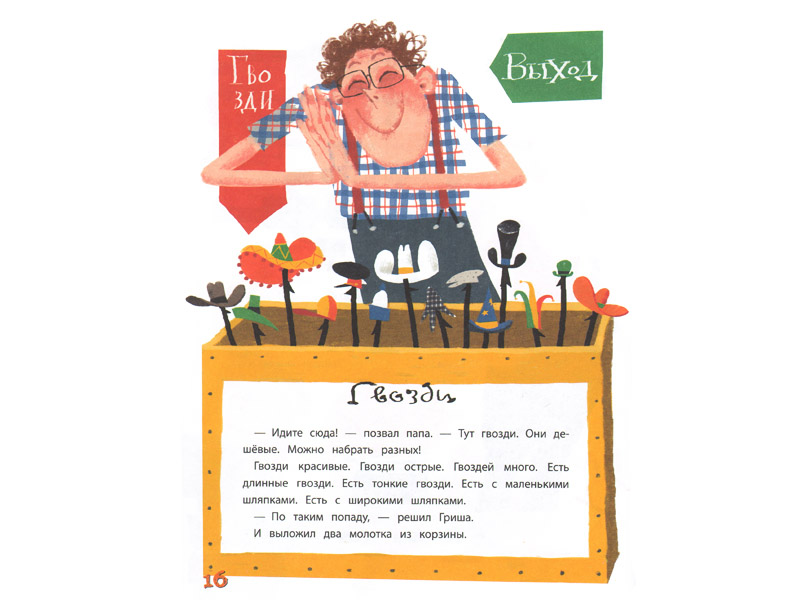 Текст построен так, что его вполне можно начинать читать ребенку вслух лет с трех, а хорошо читающий, любознательный шестилетка легко сможет прочесть его сам. Каждый рассказ занимает в книге страницу-две и состоит в основном из коротких, ритмичных фраз и часто повторяющихся слов ‒ одно удовольствие для начинающего читателя! «Гвозди красивые. Гвозди острые. Гвоздей много. Есть длинные гвозди. Есть тонкие гвозди. Есть с маленькими шляпками. Есть с широкими шляпками».