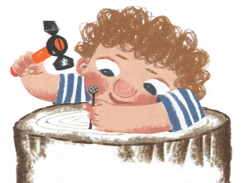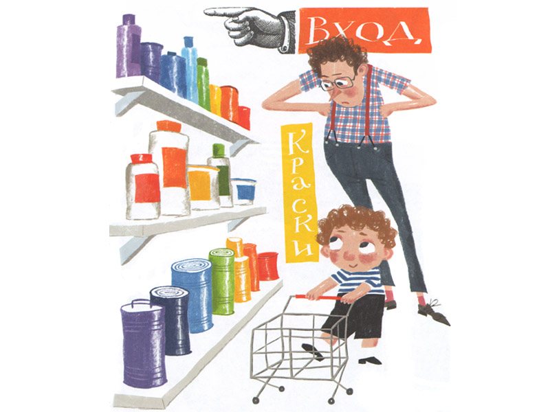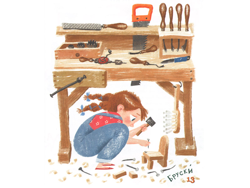 Для начала они вместе с Гришей и его старшей сестрой Машей отправляются в магазин, и вместе с ними маленький читатель узнает о существовании целого мира красивых и нужных вещей с таинственными названиями: «тиски», «наждак», «ножовка»… Они долго ходят среди полок с инструментами, прицениваются, выбирают, а читатель тем временем разбирается, что и зачем нужно столяру и плотнику. В следующей главе (целой главе!) Гриша с мамой и сестрой долго осматривают и выбирают деревяшки из залежей за бабушкиным сараем. Потом папа обучает Гришу правилам безопасности столярного труда: оборудовать рабочее место, работать в перчатках, чтобы не поранить руки, беречь инструменты, а не разбрасывать… И вот, наконец, Гриша берет доску и пилу, наконец он будет работать, как взрослый (к счастью, было воскресенье, и папа был дома). Но пила гнется, застревает в доске, и Гриша рассерженно швыряет ее в траву. Гвозди тоже его не слушаются…