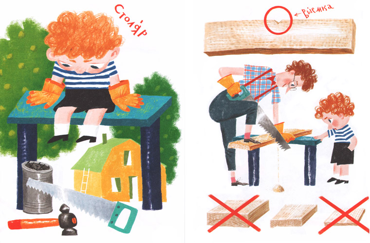 Потом подобные книжки куда-то исчезли, и вообще детская повседневность как-то перестала быть пронизанной ручным трудом. Детям оставили раннее развитие, учение и развлечения. А все нужное – можно купить в магазине. Именно так считает и старшая сестра Гриши Маша, недоумевая, зачем вся эта возня с досками и гвоздями. Но именно так и получаются из детей неумелые потребители, которые впадают в ступор при виде покосившейся книжной полки. Мне никогда не нравилась такая перспектива развития для собственных детей. И я очень жалела, что у старшего сына не было под рукой подобных книжечек на пороге его первого класса. Как бы они пригодились, когда он с энтузиазмом начал конструировать разные невероятные штуковины из всякого хлама! А среднему повезло. И теперь даже не важно, как в будущем сложатся у него в школе отношения с учителем труда. Он многому успеет научиться еще до школы. Яркая книжка Юлии Кузнецовой – хороший старт для первых шагов в мир столярного ремесла.