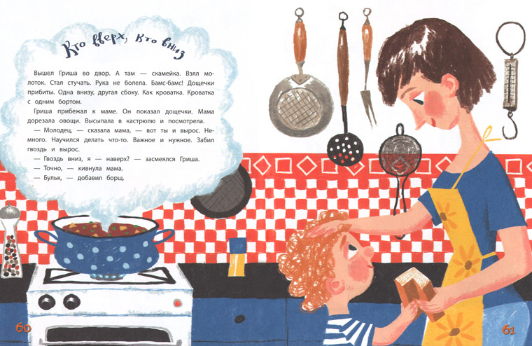 И вот что еще важно – книга не только и даже не столько о ремесле, сколько о том, что происходит в процессе ручного труда с самим ребенком. Это по-настоящему «помогающая», «поддерживающая» книга. Ни для кого не секрет, что маленькие дети часто очень быстро бросают заниматься тем, что вызывает у них трудности. Но Юлия Кузнецова так подробно и эмоционально описывает Гришины попытки и переживания, Гришина мама с таким добрым юмором поощряет своего сына, что возникающее на страницах «Столярных рассказов» настроение покоя и уверенности передается и читателю – давай попробуй, не бойся, и у тебя тоже получится. Хотя и не сразу.