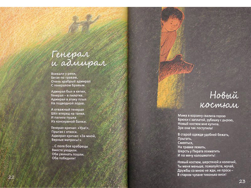 Моя версия о том, что Коля хулиганил, поэтому лифт расстроился и решил его никуда не везти, Киприана, похоже, не слишком удовлетворила. С непонимающим видом он отполз от нас в дальний угол дивана и занялся там своим конструктором. Катя тоже немного заскучала, потому что летние картинки и стихи в книге кончились, уступив место стихам о школе. Эти сюжеты и Кате, и тем более Киприану были пока совсем не знакомы, но я для себя решила, что через несколько лет мы обязательно вернемся и к сборнику «За мелом», и вообще к «подростковым» стихотворениям Сергея Махотина. В них много жизни как она есть, в ее ежедневной бытовой простоте и в то же время эмоциональной сложности. Такое сочетание, как мне представляется, особенно ценно для подростка, потому что, с одной стороны, он читает о простых и понятных ему вещах (названия стихотворений говорят сами за себя: «Мы с первого класса дружили», «Поход», «Новый костюм», «Каникулы кончились», «Контрольный диктант» и т.д.), а с другой стороны, учится прислушиваться к себе, к тому непонятному, что поднимается иногда в душе, не давая покоя. И, возможно, читая строки Махотина, кто-то сможет сказать о поэте словами его же лирического героя: