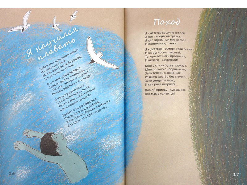 Мы с Катей тоже перебрались туда и наконец открыли книгу. На иллюстрациях, выполненных цветными мелками, ожидаемо предстало перед нами лето ‒ простое, счастливое, беззаботное. Чайки, стрекозы, листва и трава… От некоторых страниц будто бы исходил мягкий солнечный свет.