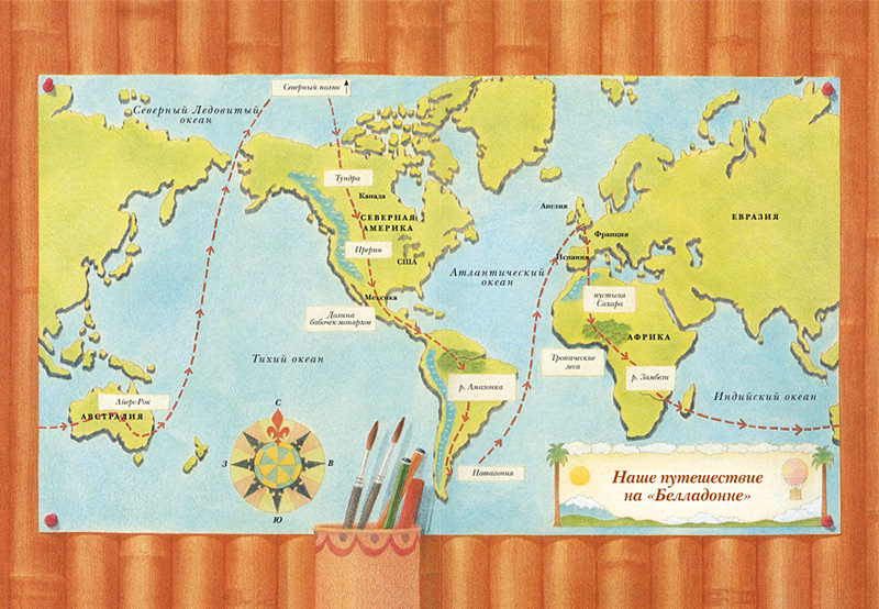 Конечно, нам сразу понадобилась карта, чтобы следить за перемещением героев по миру: из Англии – в пустыню Сахара, к верблюдам и лисам фе́нек, а оттуда – на берег реки Замбези к гориллам, потом в Австралию, к кенгуру, динго и сумчатым мышам (о том, что такие существуют, Митя впервые узнал именно из «Летающего дома»). Дальше герои со сказочной легкостью перелетают на Северный полюс, на берег канадского озера и в Мексику, достигают берегов Амазонки и, наконец, снова попадают в Англию, домой. Когда мы читали книгу с сыном где-нибудь в дороге, я мысленно благодарила издателей за то, что они поместили на форзаце книги карту, отметив на ней наиболее значимые пункты путешествия. Мои дети очень ценят книги с картами – так гораздо интереснее следить за сюжетом. Они и сами часто их рисуют в процессе чтения и игр и довольно неплохо ориентируются в реальной карте мира, которую время от времени расстилают на полу в детской. Так что и здесь Митя оказался в «зоне комфорта», что еще больше поддержало его интерес ко всей этой истории.