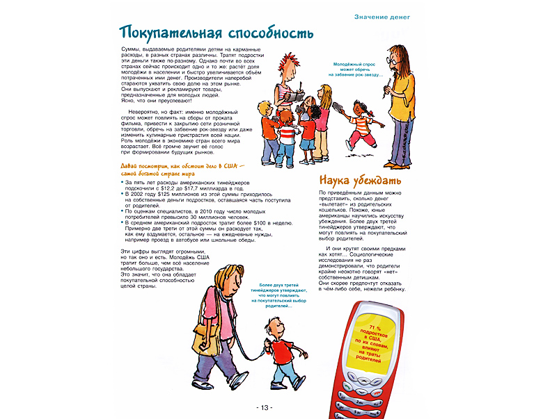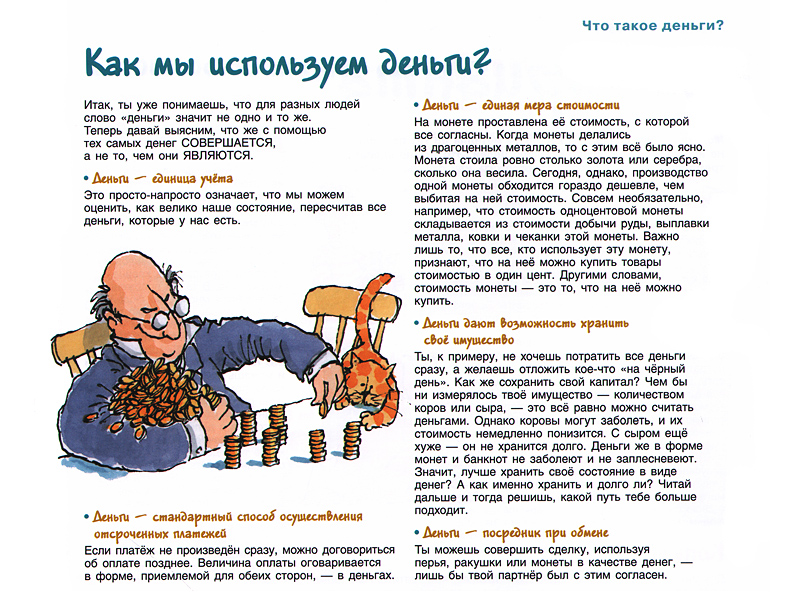 Книги «Твои деньги» и «Как потратить деньги с умом» посвящены как раз повседневной финансовой грамотности. Здесь ребенка учат составлять собственный бюджет и планировать траты, делиться с ближними, «правильно» ходить в магазин, менять валюту во время путешествия, рассказывают про банки и кредиты, про то, чем работа по найму отличается от собственного бизнеса.