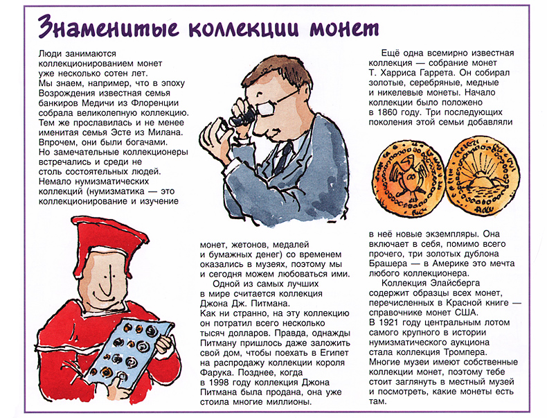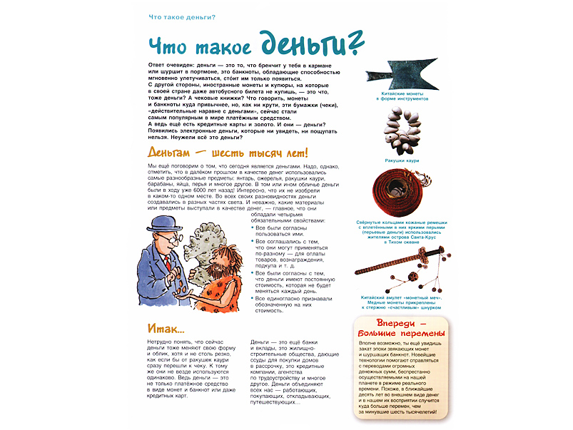 Его младшего брата я дразню «капиталистом». С самого раннего детства он обожает считать деньги в кошельках взрослых. В 6 лет он начал собирать коллекцию монет и банкнот из разных стран. В первом классе умудрился продать забывчивому однокласснику стирательную резинку (или, по-московски, ластик») за 10 рублей, мотивировав это тем, что «он сам предложил заплатить – не могу же я отказаться от денег!». У него под подушкой четыре собственных кошелька… На девятом году его жизни я поняла, что моей бытовой финансовой грамотности уже не хватает, чтобы отвечать на бесконечные вопросы о том, почему у меня пять банковских карт разных типов и банков, чем занимается ломбард в соседнем доме, о чем говорит реклама Forex в метро. Я стала искать ему книжку. Поиск был долгим. Мне все время попадались либо детсадовские истории про зверюшек, которые не могут сосчитать сдачу в магазине, либо совсем уже неподъемные и скучные учебники по обществознанию. И как же я была рада, обнаружив в продаже давно изданную серию из шести книг «Деньги? Деньги… Деньги!» с идеальным балансом текста и иллюстраций. Теперь все шесть книжек лежат на столе рядом с кроватью сына, и в свободное время он читает то одну, то другую.