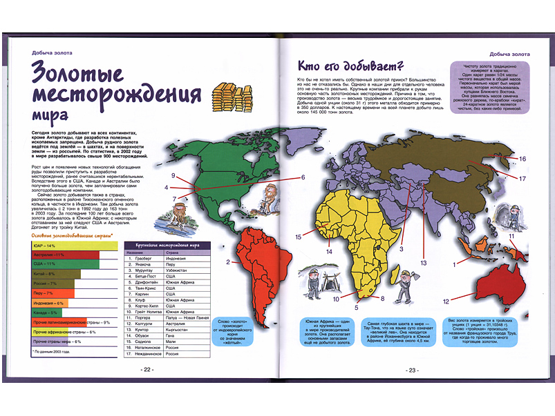 Следуя уже устоявшейся традиции детского нон-фикшн, все книги устроены «по разворотам»: крупный заголовок в начале каждого разворота сообщает его тему, затем следует небольшие, из 3‒5 абзацев, познавательные тексты, сопровождаемые рисованными иллюстрациями. В книгах много схем, таблиц, диаграмм, все они адаптированы для детского восприятия, помогая ребенку читателю решить важную образовательную задачу: научиться извлекать требуемую информацию из источников разных типов. В конце каждой книги приведен небольшой толковый словарь и полезные интернет-адреса (правда, действовавшие на 2012 год).