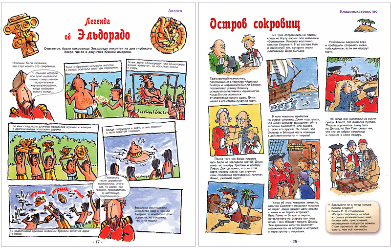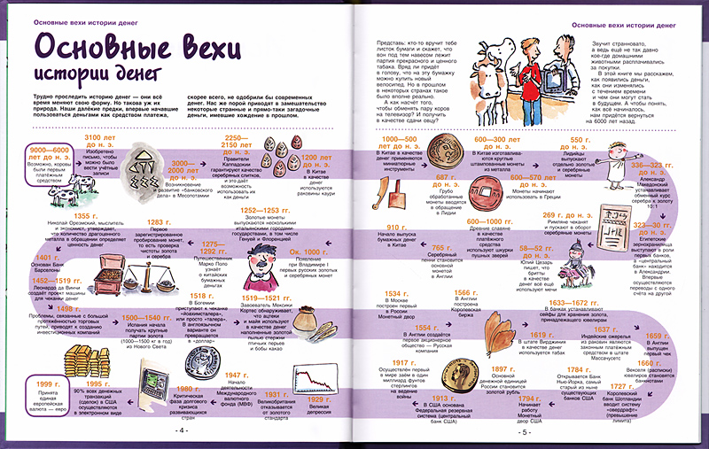 В «Истории денег» речь идет о самых разных видах платежных инструментов ‒ от индейского потлача до электронных кошельков современных горожан. Это одна из самых простых и легких книг во всей серии. Она открывается «лентой истории» денег и продолжается рассказами о золотых слитках, греческих монетах, китайских банкнотах. Здесь есть советы начинающим нумизматам, как правильно хранить редкие монеты. А еще есть несколько остроумных комиксов про Эльдорадо, Билли Бонса и зарытые клады.