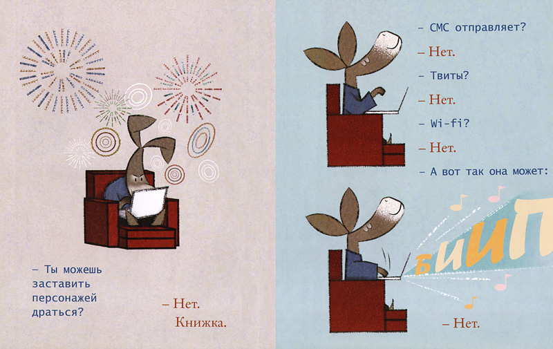 «Это книжка» Лейн Смит, в силу тонкой ироничности, адресована скорее подросткам (особенно из разряда тех, кто заявляет: «Читать умею, но не хочу»). Но и восьмилетнему человеку, легко управляющемуся с гаджетами и умеющему сравнивать предметы и явления, она будет понятна. «Понятно» ‒ в смысле «смешно». В книге действует «смешной» Осел, который по каким-то скрытым от читателя причинам никогда не «общался» с книгами. Но вопросы, которые он задает, позволяют опознать в нем искушенного компьютерного пользователя. К тому же он появляется перед нами с ноутбуком.