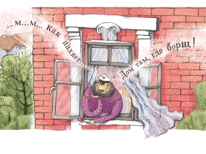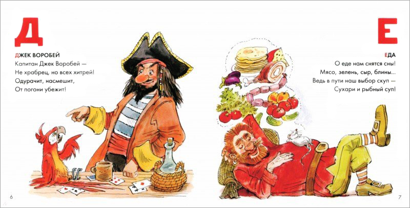 Проза для маленьких тоже не брезгует супом – представьте себе целую книжку, посвященную борщу! Непонятно, кто главный герой книги Анны Анисимовой «Капитан Борщ» (иллюстрации Инны Папоротной, издательство «РОСМЭН», 2018) – капитан или борщ. Наверно, оба сразу. Мало того, что мотор в яхте капитана работает на борще (сразу вспоминается трактор Митя Продуктовый из Простоквашино), капитан даже одеваться стал в тон любимому блюду: фиолетовый свитер, оранжевые брюки, желтые ботинки – классический набор, свекла, морковка, картошка. И белая фуражка – сметана. На борще без сметаны мотор даже заводиться отказывается. Есть, конечно, яхты, работающие на окрошке – но это второй сорт. Суп необходим не только честным морякам, но и пиратам из «Пиратской азбуки» Антона Бабчука (художник Вадим Челак, издательство «Молодая мама», 2018):