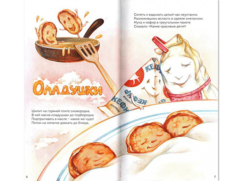 Все же многие современные поэты и поэтессы помнят, что не супом единым надо кормить ребенка – в сборнике стихов Юлии Симбирской нашлось место пышному омлету, пончику, оладушкам, котлетам, вареникам и даже торту. Но называется сборник все-таки «Суп в горошек» (художник Екатерина Глейзер, издательство «Абрикобукс», 2018). Сразу понятно, кто тут главный. Супов в книжке целых четыре – молочная лапша, суп с горошком, бульон и рыбный суп, ну и необходимая каша тоже не забыта. Полный рацион одушевленных рецептов и полезных блюд.
