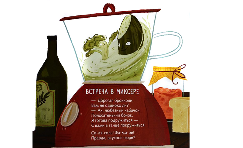 Состоянием души брокколи интересуется, естественно, кабачок. Они сливаются в экстазе овощного пюре в стихотворении «Встреча в миксере» из «Майкиной книжки» (художник Мария Муравски, издательство «Клевер-Медиа Групп», 2015). Не захочешь, а съешь. Видимо, в этом и задача. Всем взрослым отчего-то хочется, чтобы дети прямо-таки любили суп и овощи. Они-то, взрослые, их любят. Значит, и дети должны. А может лучше подождать, пока дети вырастут и искренне полюбят супы во всем их разнообразии? Между прочим, в американской поэзии для детей места супу не нашлось – детям его каждый день не дают, вот и в стихи он не попадает. Впрочем, овощей там хватает с избытком – в них же столько витаминов!