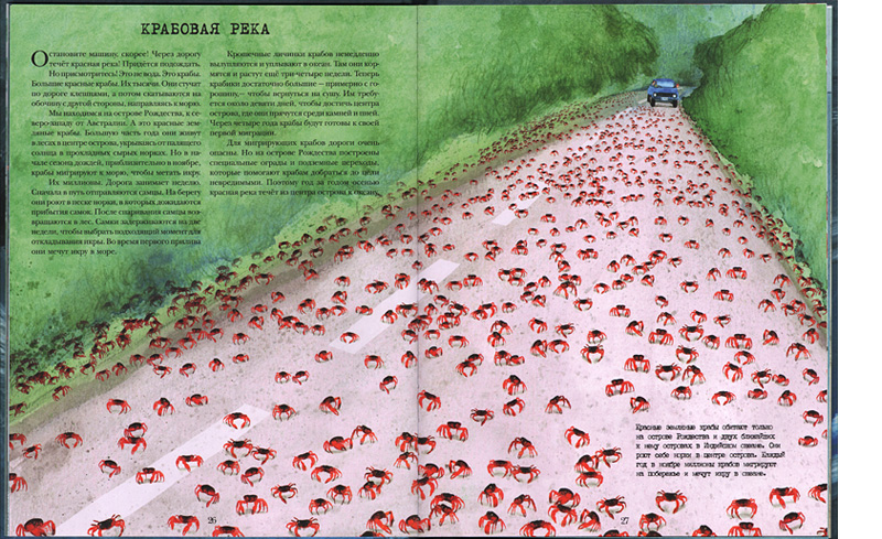 Название книги звучит по-взрослому: ребенку дошкольного возраста, да и первокласснику слово «миграция» придется объяснять. Но в остальном язык книги понятный и увлекательный. А из введения ясно, что речь пойдет о сезонных путешествиях животных: «Множество разных животных по всему миру преодолевают огромные расстояния, пересекая горы, пустыни и океаны. Миграции (так называются эти путешествия) бывают разные…». Каждый разворот книги посвящен какому-нибудь животному путешественнику: это может быть крошечная птичка колибри, а может – гигантский синий кит. Страница за страницей, перед читателем разворачиваются фантастические пейзажи с мигрирующими животными. Чего стоит шоссе, по которому «струится» красная крабовая «река»! Или лес, от земли до верхушек елей заполненный бабочками-монархами. А бесконечная вереница пингвинов, двигающихся друг за другом, в глубины антарктического материка! Удивительные, захватывающие зрелища. За миграциями животных стоят довольно странные и неодолимые инстинкты, связанные, в первую очередь, с продолжением рода и часто ‒ с поиском пищи. Так что книга открывает читателю и бесконечное разнообразие животного мира, и его единство, и власть законов природы.