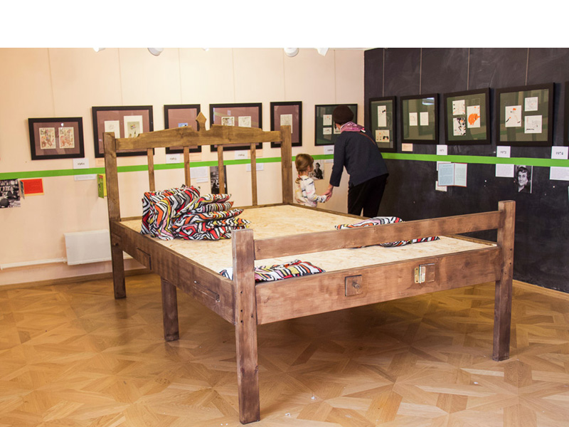 Большая кровать – любимый экспонат детей. Во время экскурсии мы вместе забираемся на нее и читаем, рассказываем, как Астрид Линдгрен создавала свои книги. (В зале выставлены макеты обложек ее книг, какими они выходили при ее жизни.) Кровать – это уютное место, где рождаются истории. Дети затихают и слушают. Можно прилечь на подушки. Среди них есть четыре «говорящие» – внутри спрятаны колонки с аудиоспектаклями по книгам «Малыш и Карлсон», «Мио, мой Мио!», «Эмиль из Лённеберги» и «Пеппи Длинныйчулок».