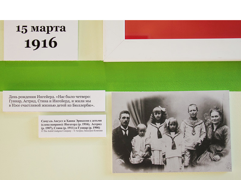 Большую часть экспозиции мы хотели посвятить именно детским годам Астрид Линдгрен, поскольку многие сюжеты ее книг родом из ее детства. Астрид была очень дружна со своим братом и двумя сестрами. Вместе они осваивали мир через игры. Астрид потом вспоминала о них так: «Настоящее чудо, что мы не доигрались в детстве до смерти!» Мы понимаем, что это были игры с опасными приключениями, экспериментами и отважными исследованиями на прочность мира и часто ‒ самих себя. Но при этом дети знали свои обязанности и помогали родителям по хозяйству. Родители относились к ним с уважением и доверием, давали любовь и свободу, и такое отношение к детству Астрид Линдгрен передала потом в своих книгах: «Мне кажется, что наше детство было счастливым именно потому, что мы ощущали себя свободными и защищенными».