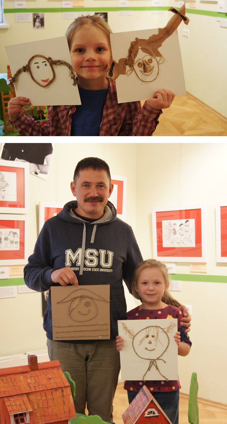 А потом мы рисуем портреты Пеппи Длинныйчулок. Такую необычную девочку можно рисовать только с помощью необычных материалов. Поскольку папа Пеппи был капитаном корабля, мы предлагаем посетителям использовать веревки разной длины и фактуры. Самое интересное, что все Пеппи так или иначе похожи на своих создателей. Родители тоже с удовольствием включаются в процесс. Папа одной девочки даже сделал портрет Эфраима Длинныйчулок, папы Пеппи.