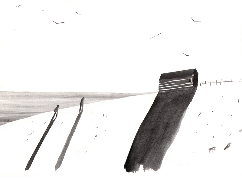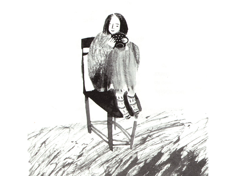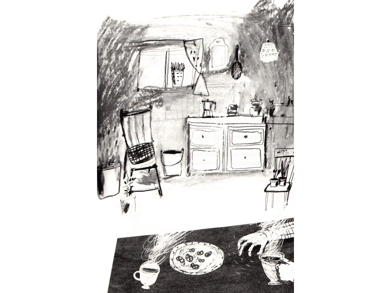 Черно-белые иллюстрации Ани Леоновой такие же слегка наивные и угловатые, как и герои истории. Они похожи на наброски и не перетягивают внимание на себя, а лишь пунктирно обозначают контуры отдельных деталей сюжета: одинокий маяк, бутылки на волнах, три пары детских ног в воде, россыпь черники, дымящаяся чашка кафе на столе… Образы героев также намечены эскизно и дают простор воображению читателя.