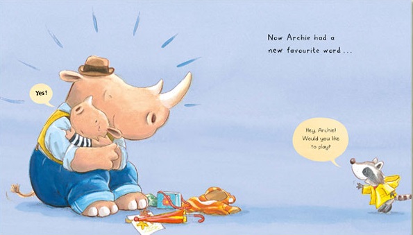 It’s this word that a little rhino named Otto (or Archie in the British editions of the book) one day discovers. The “no” becomes his curse. The word carries frightening power and soon displaces all other words.