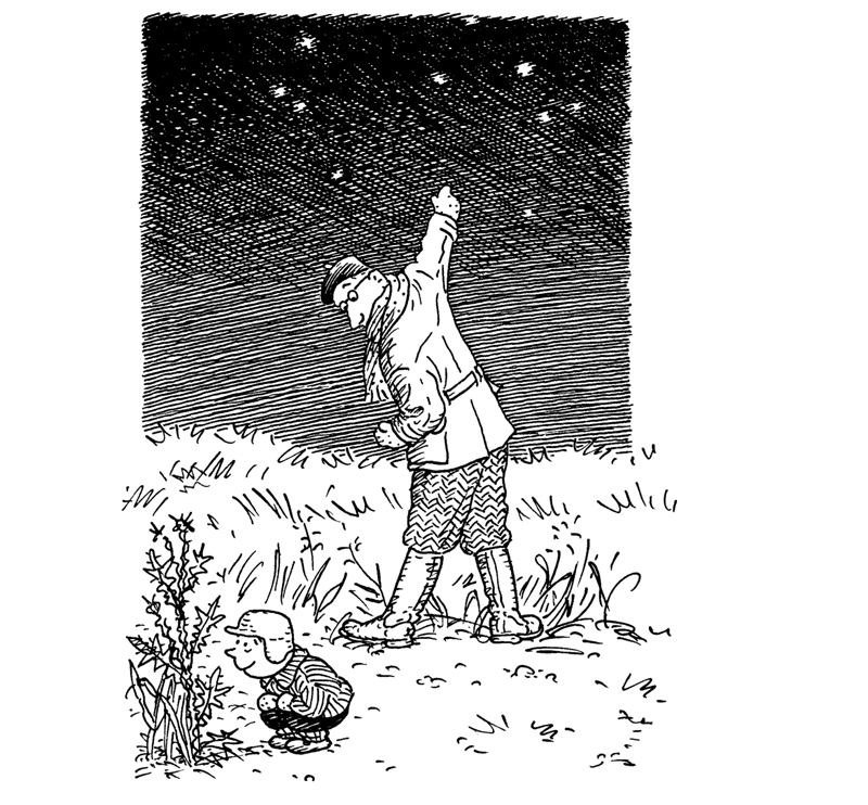 Я хорошенько присмотрелся, хотя было уже почти совсем темно, и заметил улитку из вселенной, она ползла по камню. И увидел травинку, которую качал ветер из вселенной. А еще там рос цветок, я знал, что он называется чертополох. Папа стоял рядом и смотрел в небо.