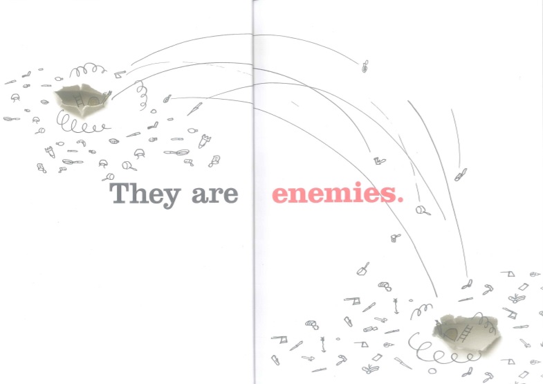And then the real world breaks through the fiction: there are photographs amidst the illustrations. These are the enemy’s family members. Someone volunteers a hesitant “maybe the enemy is good too?” and over the next few pages that hunch grows into exclamations and certainty. At this point, the children start losing track of which soldier is which. Both are so alike and both are “good”... Finally, we have the last spread: the two former enemies throw each other bottled messages about the end of the war. The book ends with an ellipse.