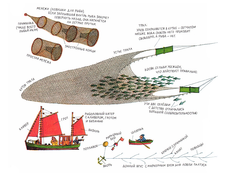Среди текстов книги читатель с любыми предпочтениями найдет что-то такое, что его непременно зацепит. Тут и исторические статьи, и «краткие пересказы» мифов и легенд (для тех, кто больше всего на свете интересуется морскими чудовищами), и разного рода подписи под картинками – короткие и развернутые. Подписи можно было бы классифицировать и с точки зрения авторской интонации: это – серьезные «информационные сообщения» («Мерёжи – ловушки для рыб. Если заплывшая внутрь рыба захочет повернуть назад, она наткнется на острые прутки»), а это – коротенькие авторские ремарки «о другом», полные юмора («Эти две селедки с детства отличались большой сообразительностью» – о рыбках, не последовавших за своим косяком в ловушку).