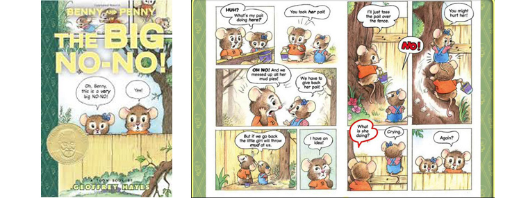 Benny and Penny in the Big No-No by Geoffrey Hayes is essentially a comic, but in a more complex format. It touches on some pressing concerns—at least, what constitutes pressing concerns for five- to six-year-olds. What should you do, for example, if your sister is a crybaby or you lost your bucket and you want to play with the neighbor but don’t know how to make friends with him? The Big No-No won the 2010 Theodor Seuss Geisel Award for the best book for beginning readers.