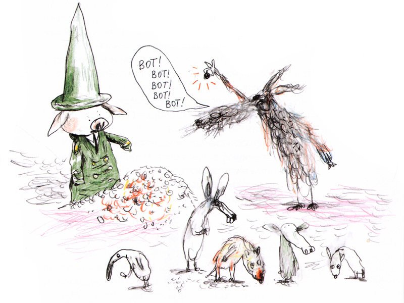 Что такое иллюстрация в детской книжке? Это линза, которая делает наше читательское зрение более острым, более точным, фокусирует его на главном – или на том, что может ускользнуть от беглого взгляда, но при этом важно для сюжета. Первое, что цепляет в этой книжке – рисунки. Они как будто нарисованы рукой маленького ребенка. Линии кривятся, вылезают за контур, смазывают логику силуэта. «Детские» рисунки в качестве иллюстрации – это намек на то, что каждый, кто откроет эту книгу, становится ребенком. И это правда.