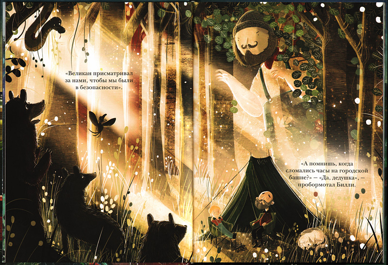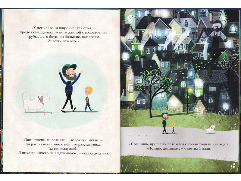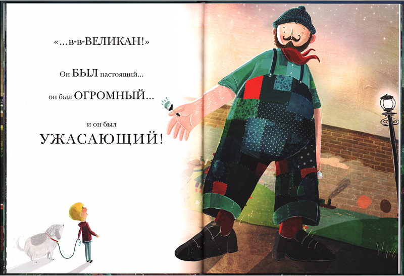 Автор и художник Дэвид Литччфилд создал оригинальный мир, озаренный таинственным волшебным сиянием. Яркие развороты страниц, почти полностью занятые иллюстрациями, игра света и тени, появление Великана в самых неожиданных местах, ‒ все это будоражит воображение ребенка. Эту книгу хорошо подолгу рассматривать вместе ‒ может быть, даже еще до чтения, особенно, если читателю около пяти лет, ‒ и предлагать ребенку обратить внимание на этот таинственный свет, на выражение лиц героев, их жесты, мимику. Что с ними сейчас происходит? Почему ты так думаешь?