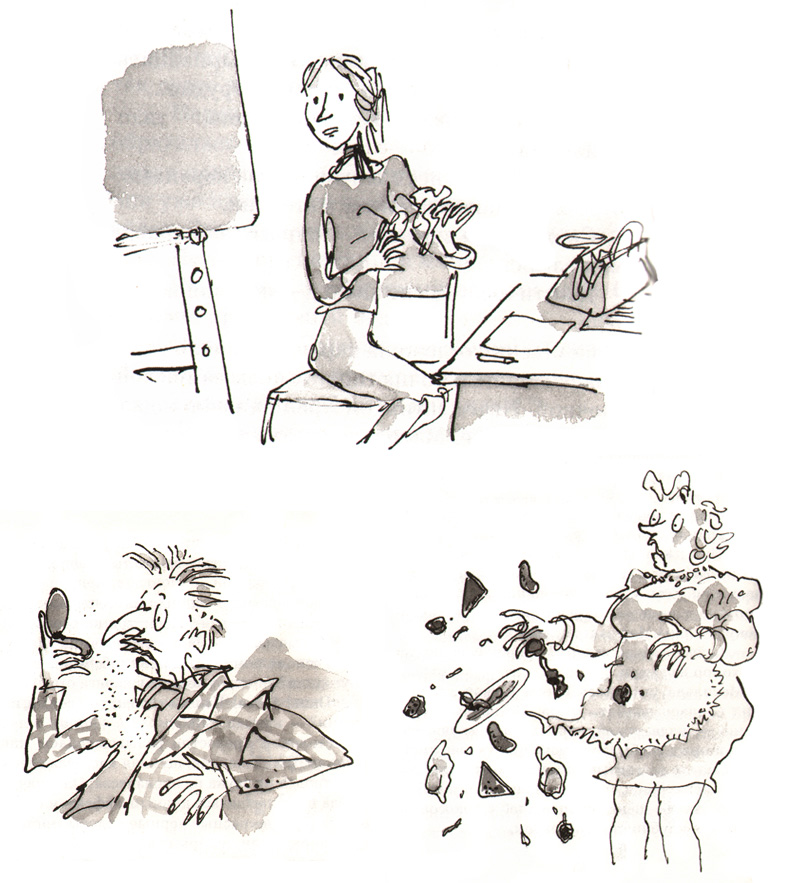 Иллюстрации в книге тоже несерьёзные: они похожи на карикатуры и идеально передают атмосферу книги. Например, учительница Матильды изображена как абсолютно нормальный человек, а родители главной героини больше похожи на карикатуры. Как правило, чем больше утрирован персонаж в тексте, тем смешнее он выглядит на рисунке.