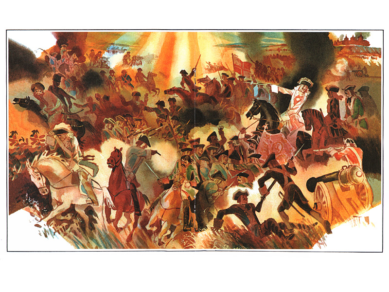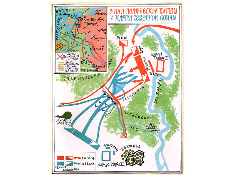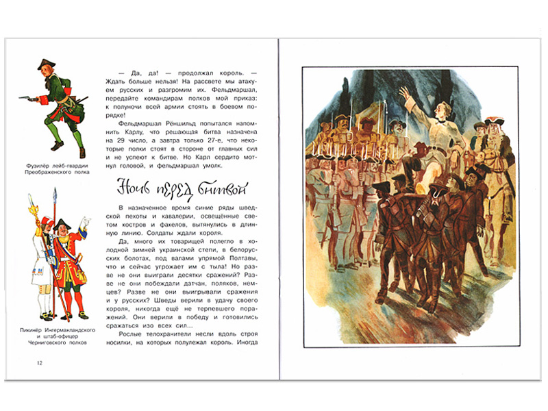 Теперь есть возможность читать полюбившиеся рассказы в новом формате. Издательство «Лабиринт» осуществляет их выборочное переиздание в рамках проекта «Страницы истории». Одна из книг новой серии «Лабиринта» – рассказ Якова Гордина «Полтавская битва». Тридцать шесть страниц можно прочесть с ребенком шести-семи лет вслух за два вечера, а хорошо читающий второклассник и самостоятельно справится. Короткие главы, небольшие предложения и эмоционально заряженные диалоги героев удерживают читательское внимание на протяжении всего текста. Но еще до начала чтения стоит просто полистать книгу – красочные батальные полотна на всю страницу вряд ли оставят мальчишек равнодушными, как и фигурки русских и шведских солдатиков в форме своих полков, с подписями их званий. Отличный материал для будущей игры. А то, что по следам чтения традиционная мальчишеская возня с солдатиками активизируется, это совершенно точно. Возможно, к купленным в магазине наборам добавятся бумажные и картонные собратья по оружию. У нас, во всяком случае, было именно так. Дети часто играют по следам книг, которые их эмоционально «зацепили». У Якова Гордина герои Полтавской баталии выглядят совершенно живыми людьми, а не тенями прошлого. Великодушный и грозный Петр I, празднующий победу над шведами и угощающий в своем шатре пленных генералов. Увлеченный пылом битвы Меньшиков, не слушающий повелений своего императора. Самоуверенный Карл XII, страдающий от боли в простреленной ноге, но все равно жаждущий победы. Его благоразумный генерал Рёншильд, который предлагает повременить с наступлением. Перебежчик из русского лагеря, который выдает Карлу военные секреты, хитрый Мазепа, который не хочет рисковать своими казаками. Встретившись с такими хара́ктерными героями, многие дети захотят не просто передвигать солдатиков по столу, а использовать в игре реплики из книги. А это значит, что самая важная для ребенка, эмоциональная встреча с историческим событием состоялась. Теперь Полтавская битва 1709 года будет не строчкой из учебника или энциклопедии, а личным переживанием. Я специально спросила своего семилетнего сына после чтения – не помнит ли он случайно, когда именно была битва, и он моментально ответил. Хотя никакой цели запоминания исторических фактов никто перед ним не ставил. Мы просто читали перед сном. А теперь я думаю – не почитать ли вдогонку отрывки из пушкинской «Полтавы»?