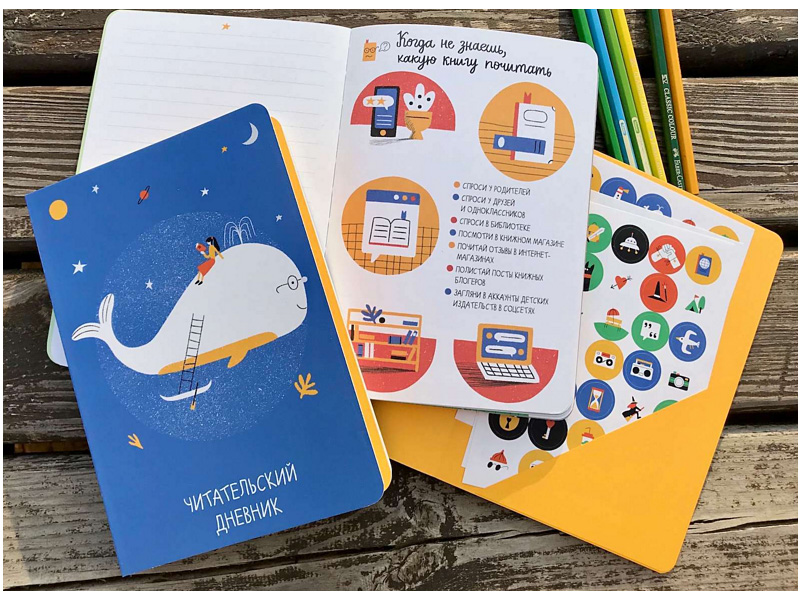 Некоторые подсказки «Дневника» связаны с самим процессом чтения – как читать, где читать, как выбрать книгу. Они немного похожи на рекомендации школьных библиотекарей: обращай внимание на заголовки, рассмотри обложку, приклеивай цветные стикеры на понравившиеся страницы, запиши, что тебе понравилось в книге, и ищи дальше что-то похожее по теме или настроению. Я что-то не припомню, чтобы кто-то из моих запойно читающих детей делал так. Они просто ныряют в книгу с головой, особенно не задумываясь, а потом взахлеб делятся впечатлениями и перебрасываются цитатами. Но, я думаю, этот способ прекрасно подойдет читателям с другим темпераментом, другим читательским опытом и тем, кто еще не умеет сам искать подходящие ему тексты. Страничку «Когда читать книги» сын сразу захотел дополнить своими идеями. Кроме очевидных – «в дороге, в очереди, когда ложишься спать» он предложил еще: «сидя между веток яблони в саду – не жарко и весело», «на пляже, когда обсыхаешь после купания», «с фонариком под одеялом», «на скучном уроке под партой», «когда идешь домой – но это опасно, можно зачитаться и не заметить машину!».