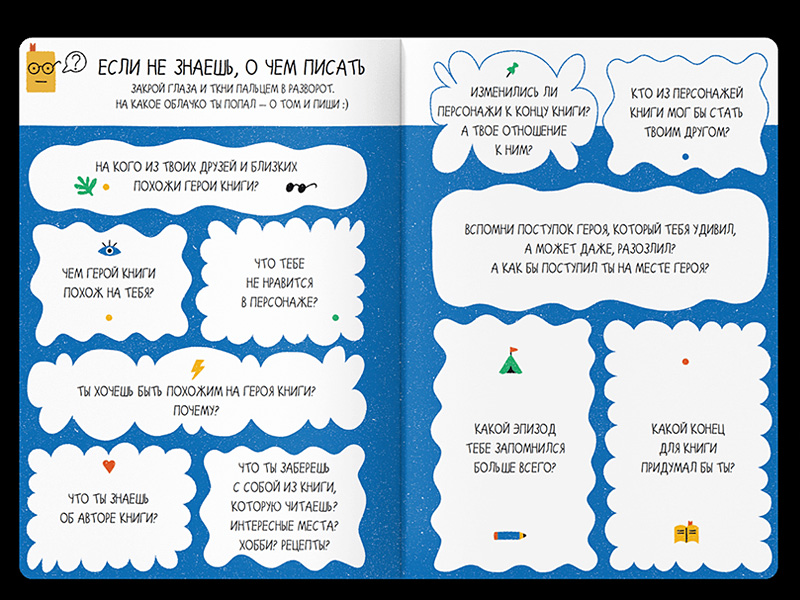Это даже не анкета с вопросами типа «твой любимый/нелюбимый герой», а забавная игра, пробуждающая мысль и воображение. Если совсем нет никаких идей, закрой глаза, попади пальцем в вопрос на развороте и попробуй честно на него ответить. Вопросы, кстати, самого разного плана, так что, действительно, может получиться неожиданный текст.