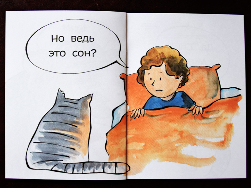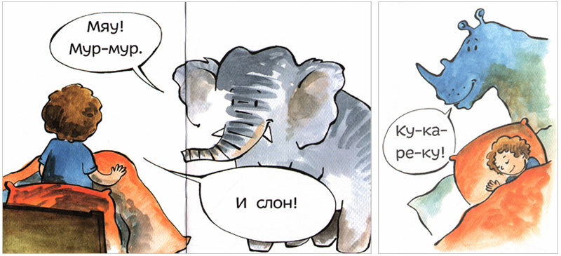 Еще одна любимая история – «Это сон?», перевертыш в духе Чуковского. Спящему малышу снятся разные звери, которые разговаривают совсем не так, как в жизни. Носорог кричит «ку-ка-ре-ку», слон говорит «мур-мур», кот не мяукает, а мычит «му-у». Федя тут же заметил, что так не бывает. Но это же сон! И мы поговорили немножко о снах, которые видели, и обо всех этих животных.